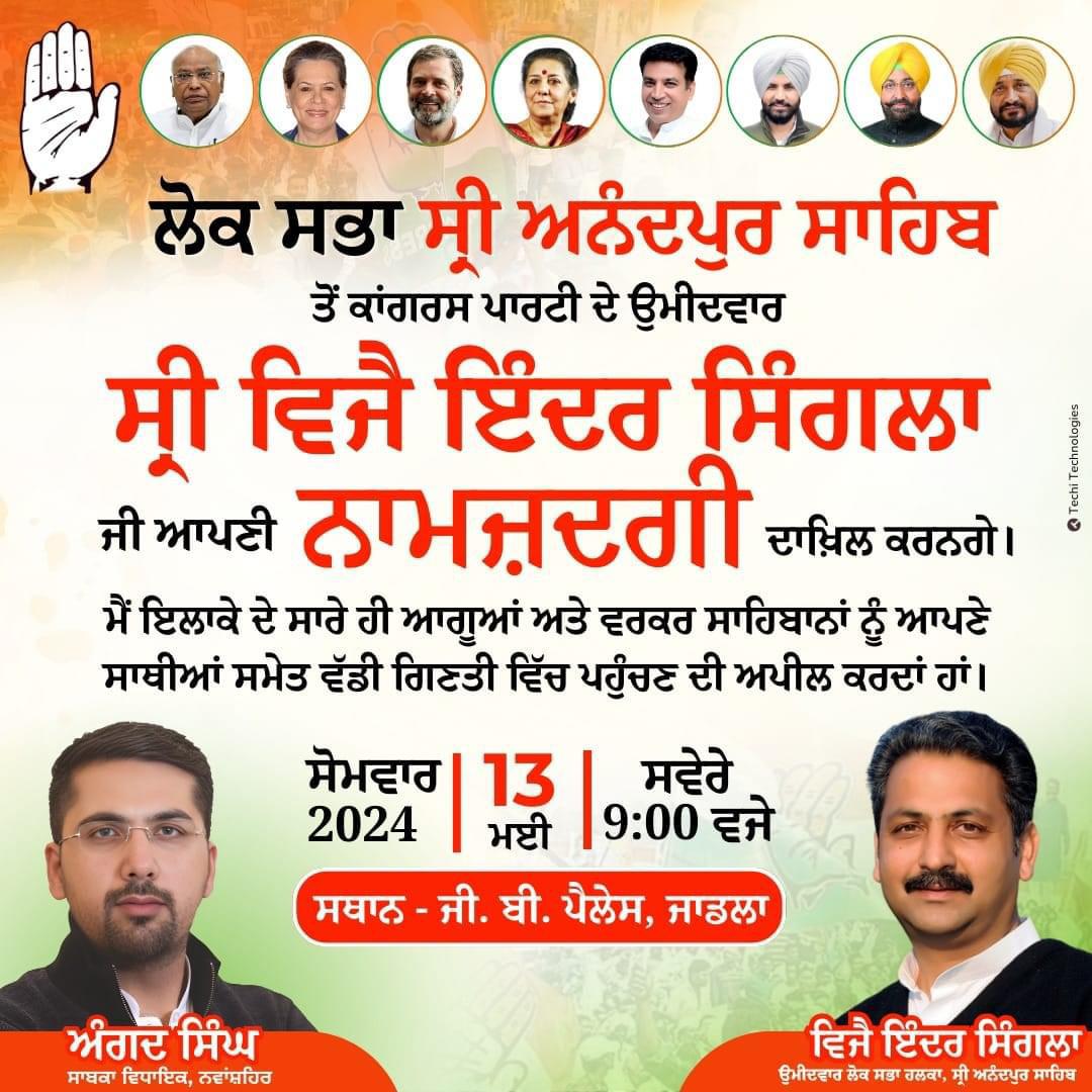 कल दिनांक 13-5-2024 सोमवार को लोकसभा प्रत्याशी श्री विजय इंदर सिंगला जी अपना नामांकन दाखिल करेंगे।