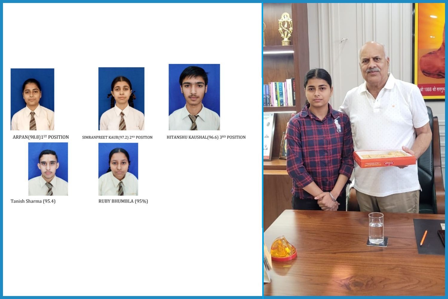उन्होंने बताया कि अर्पण ने 98.8% अंकों के साथ पहला स्थान, सिमरनप्रीत कौर ने 97.2% अंकों के साथ दूसरा स्थान और हितांशु कौशल ने 96.6% अंकों के साथ तीसरा स्थान हासिल किया। इसके अलावा तनिष शर्मा ने 95.4% अंक और रूबी भुंबला ने 95% अंक हासिल किए।